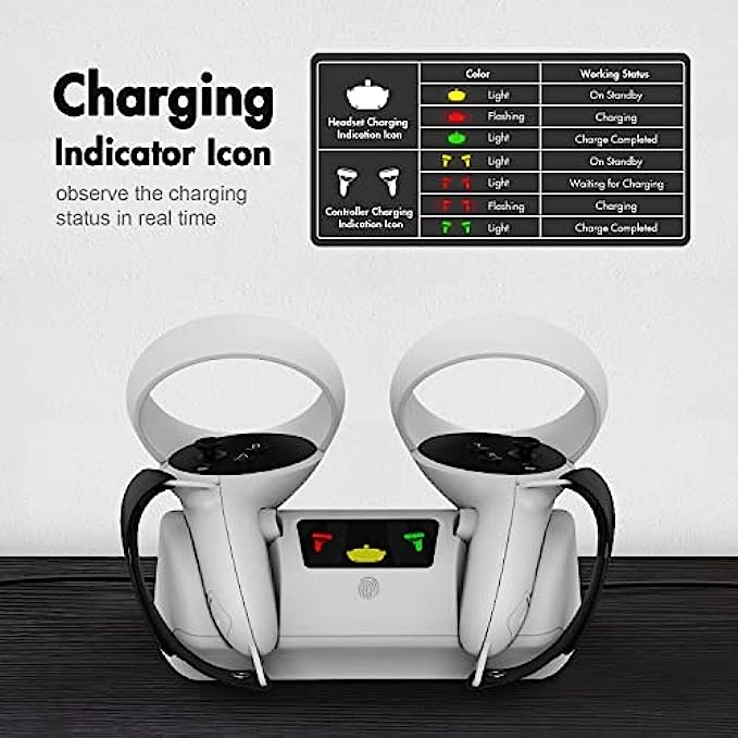 Fast and Safe Charging -- The Charging Station for Oculus Quest 2 charges the VR headset first, then the Oculus Quest 2 controllers. Our product only takes 3 hours to fully charge the quest 2 touch controllers with wrist straps. Included 2* rechargeable AA batteries have built-in overcharge protection, No heat and very durable, no harm to your VR controllers