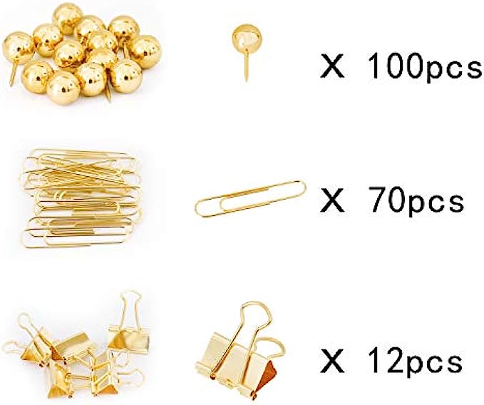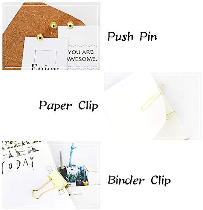 Multi-Purpose: Fashionable metallic paper accessories set has a variety of items to suit your paper organizing needs. Binder Clips and Paper Clips are ideal for holding papers, notes, receipts, bookmark, files, tickets, other small items etc. Push Pins Use to pin important messages on any bulletin board, cork board, foam board, map and more. Map Tacks best for marking locations, Pin Clips leaving No Holes for photo or paper when holding.