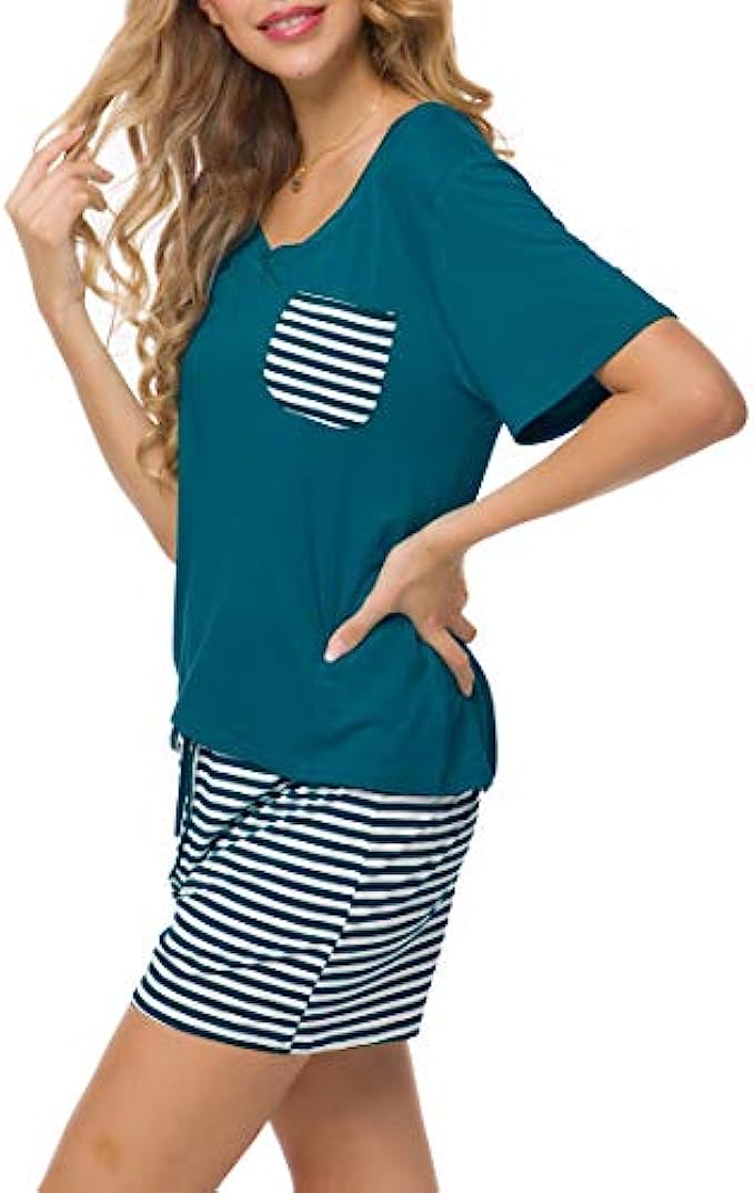 95%Viscose/5%Spandex Imported Pull On closure Hand Wash Only Soft material: The face fabric is stretchy, soft, lightweight, breathable and comfortable to wear as sleepwear/loungewear at home in hot days. 2 Elegant and simple styles to choose: 1, Beige trim decor around the neck and the bottom of shorts, solid colors; 2, Solid colored shirt top with real pocket decoration, classic stripes patterned shorts bottom ELASTIC WAISTBAND: The stretchy elastic waistband ensures that your shorts will remain securely, but comfortably, on your hips throughout the day.