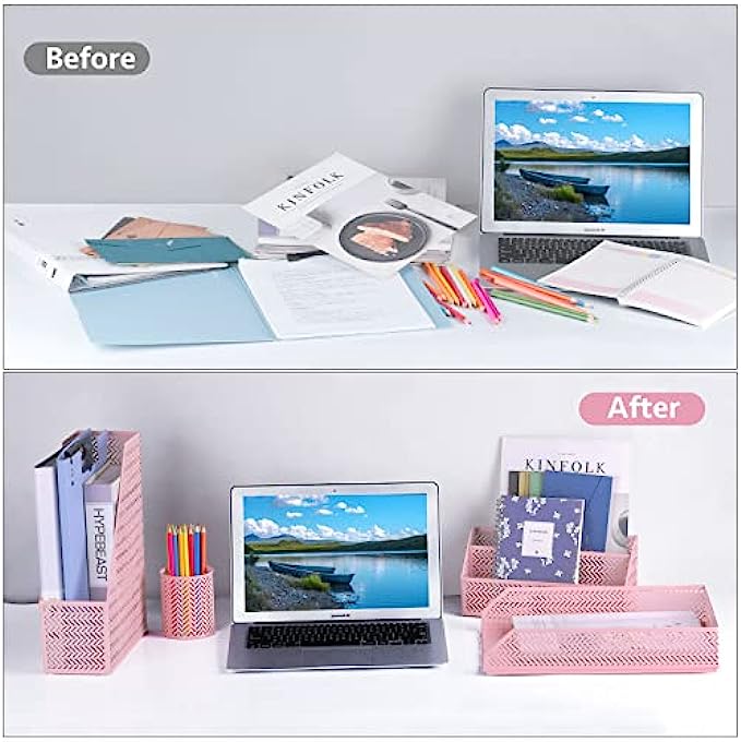 【Four Set Office Organziers Combination to Satisfy Your Needs】: You can store all your accessories with cute desktop organizers for office. One pencil cup, Letter Sorter, Magazine Holder and Paper Tray