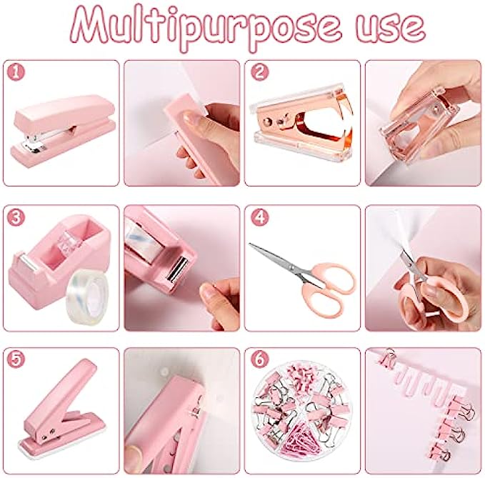 【Durable Material】The pink stapler and tape dispenser set are made of high-quality plastic material, which is durable and has strong stability, the hole punch and stapler are made of high-quality metal material, which is strong and unbreakable, and the binder and scissors are also easy to use