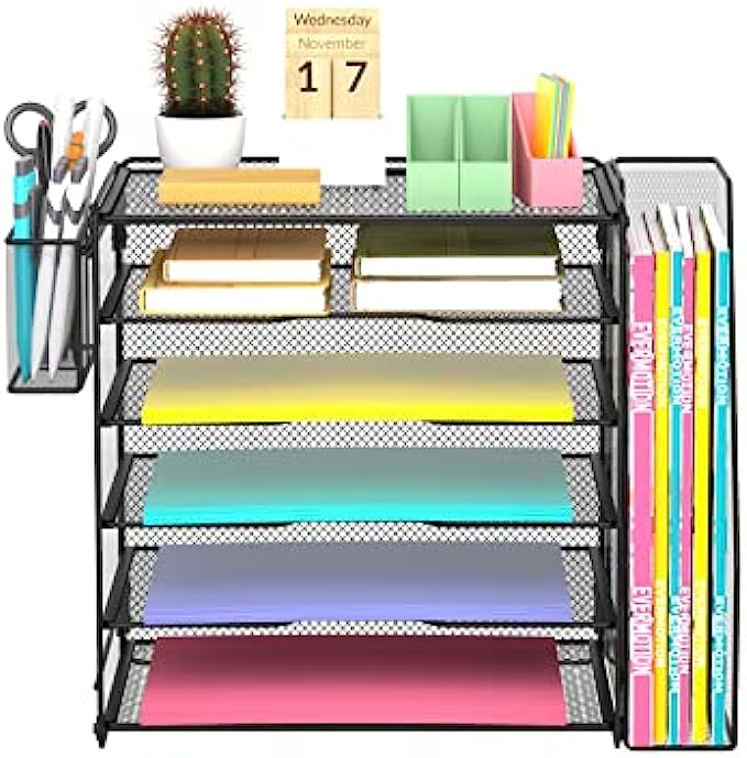 Unique 5+1+1 Shelves Design: 5 Tier sliding trays are perfect for storage all your A4/letter sized papers and file folders, 1 vertical magazine rack is ideal for place your other books and magazines, 1 pen holder is ideal for organize all your pen and pencils.