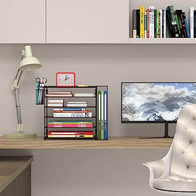 Multiple Use Desk Organizer: Can hold all your printer paper, documents, file folders, mail forms and other paper letters. Extra vertical file sorters can stand your books and magazines,pen holders can storage your other desk accessories, all-in-one desk organizer.
